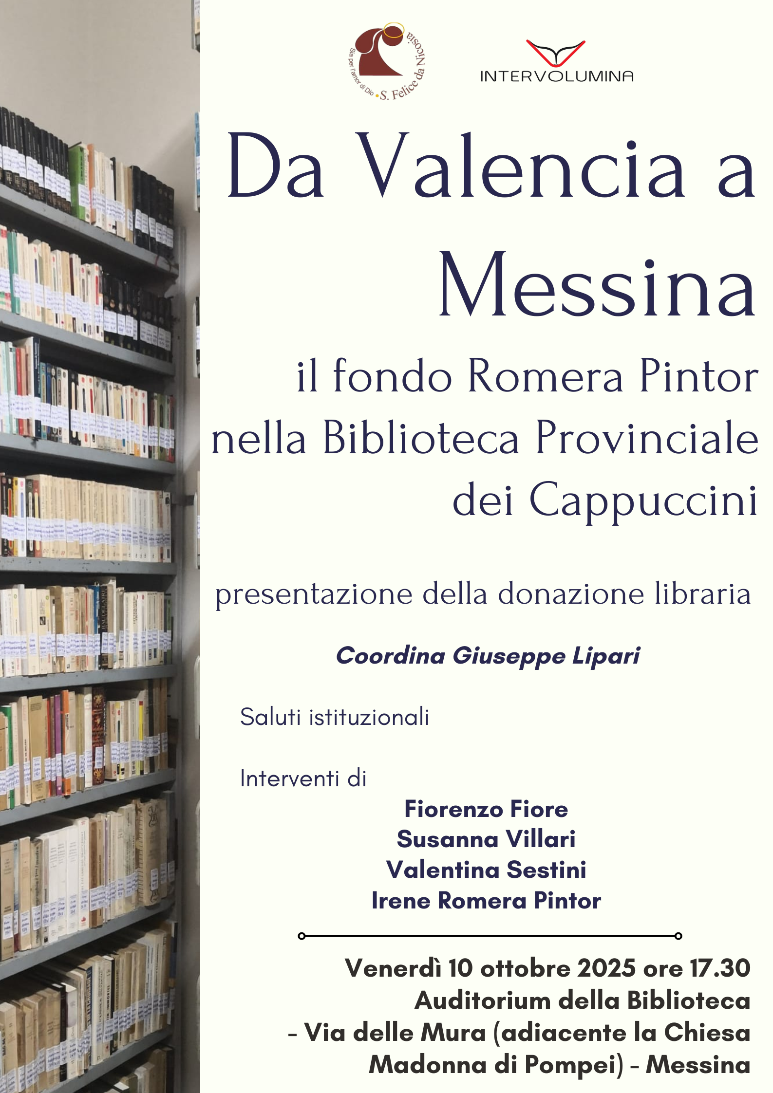 Venerdì 10 ottobre 2025 alle ore 17.30 presso l’Auditorium della Biblioteca dei Cappuccini di Messina verrà presentata alla città il fondo librario Romera Pintor donato dalla professoressa Irene Romera Pintor alla Biblioteca dei Cappuccini di Messina.